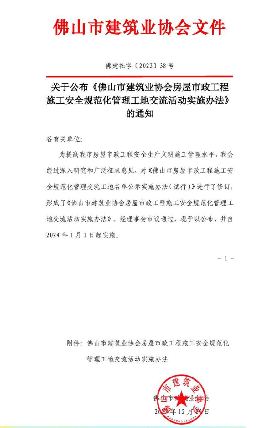 关于公布《佛山市建筑业协会房屋市政工程施工安全规范化管理工地交流活动实施办法》的通知(佛建社字〔2023〕38号)